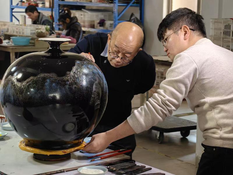 林剑军(右)与台湾导师黄宝贤一同创作瓷胎花瓶。