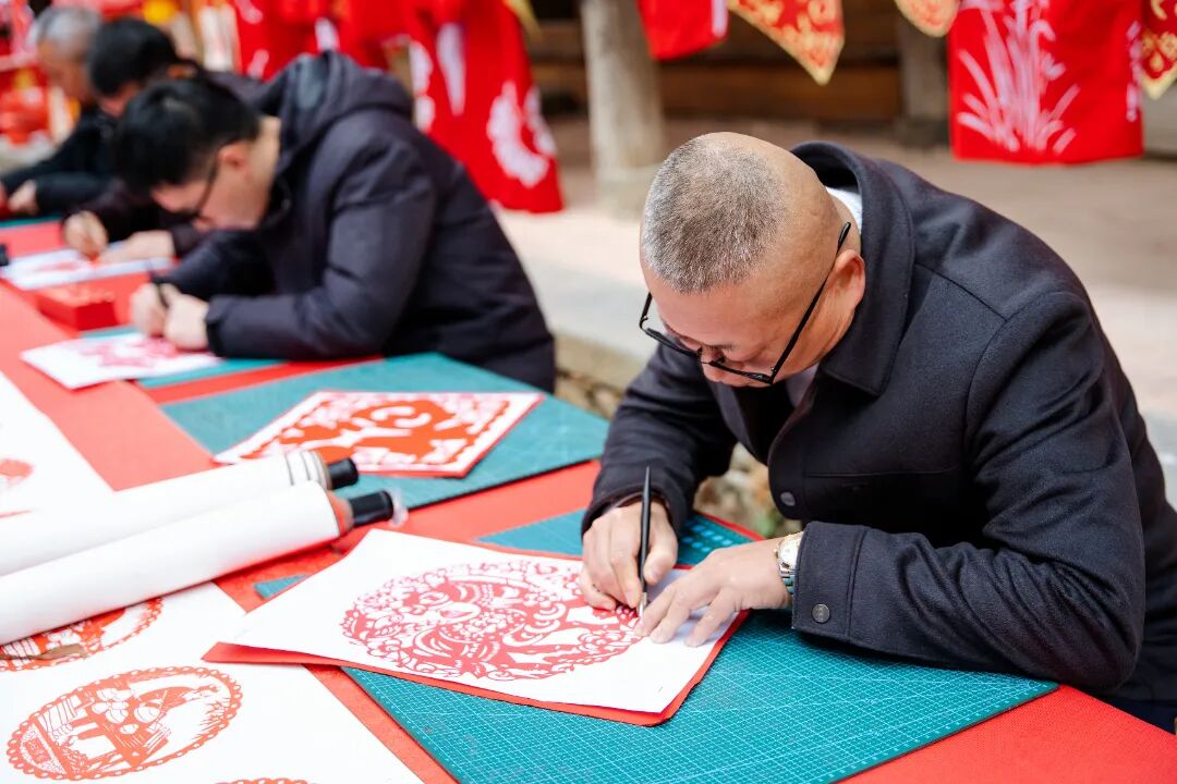 县剪刻纸艺术研究会专业艺人开展了一场生动的剪刻纸示范教学活动。艺人们以马年生肖、古堡建筑、陶瓷纹样、吉祥寓意为核心创作主题,手持刻刀行云流水,红纸在指尖翻转,片刻间,灵动的奔马、古朴的古堡窗棂、精致的陶瓷莲花纹、喜庆的福字窗花等作品便栩栩如生。现场群众纷纷围拢学习,从孩童到老人,都拿起刻刀、红纸跟着艺人一步步操作,艺人们耐心指导握刀技巧、刻制手法,手把手教大家完成简易剪刻纸作品,让非遗元素走进大众,推动非物质文化遗产活态传承、薪火相传。