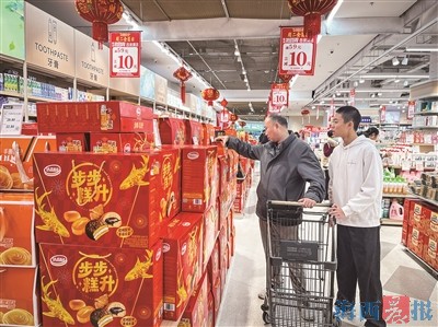 为抢抓消费热潮,厦门各大商超及线上平台纷纷启动年货促销活动,氛围感拉满。在集美区一家超市内,显眼位置专门设置了年货专区,礼盒琳琅满目,包括糕点、坚果、酒水、生鲜等多个品类,满足市民一站式采购需求。